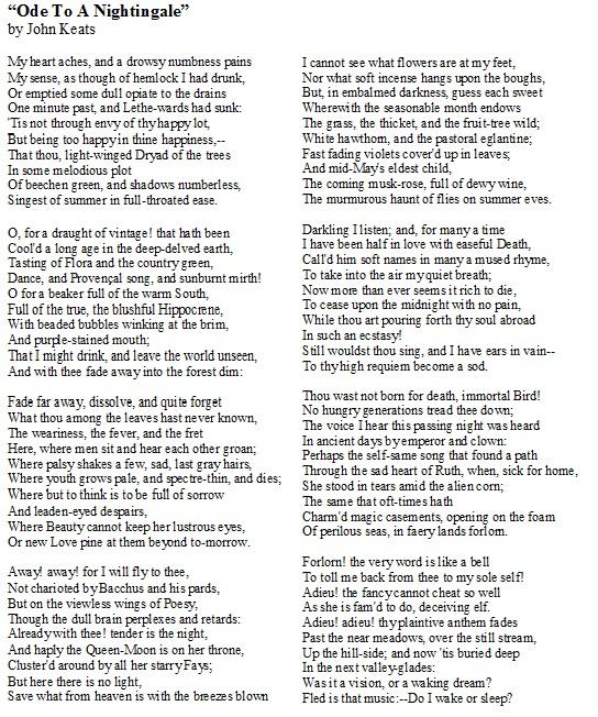 "She Walks In Beauty", "Ode On A Grecian Urn", "Ode On Melancholy" and "Ode To A Nightingale"