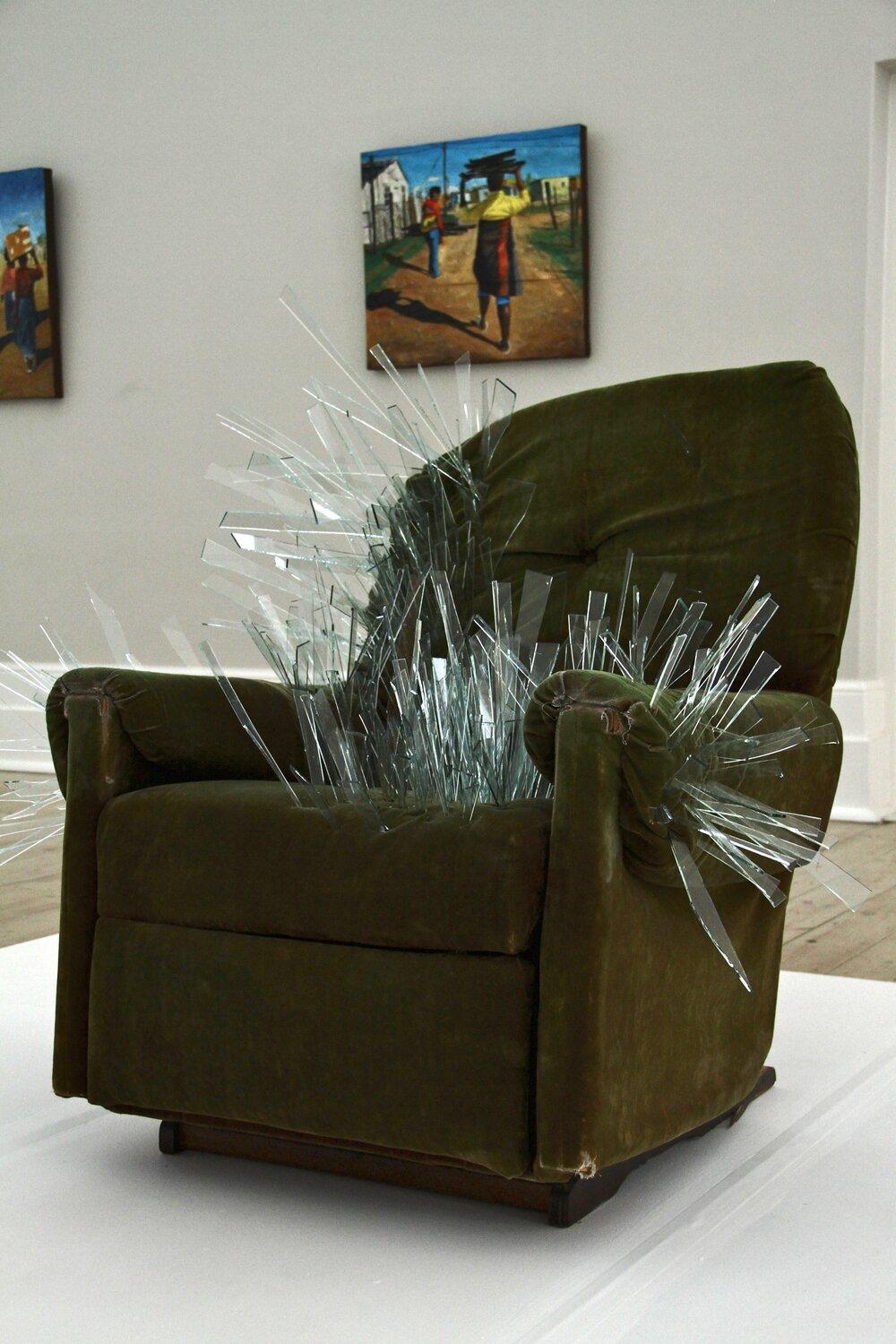 Bongani parallels his artwork with his own description of a father’s looming and eerie presence. The armchair is the ideal father figure who is to provide a certain emotional availability for the family. However, the glass pieces underline a defect in the father’s parental abilities. The chair, as an idea, becomes distorted and frightening, something to evade from. And as a literal and palpable thing, to be within its perimeters sounds terrifying, and it becomes painful to touch, closely resembling a father figure with abusive inclinations and disruptive behaviors.